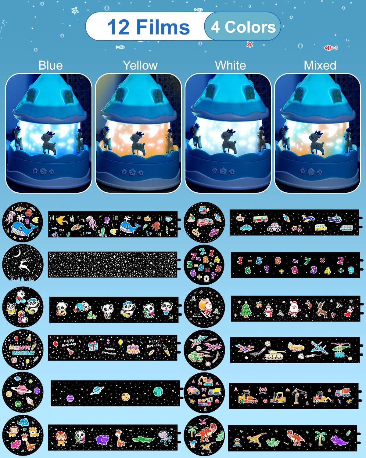 đ ăCarousel Design & 48 Light Modesă The charming carousel features 12 themed filmsâdinosaurs, animals, ocean scenes, space adventures, birthday parties, Christmas and more. Combined with 4 LED color options, it delivers 48 unique lighting experiences to turn any room into a mesmerizing wonderland.