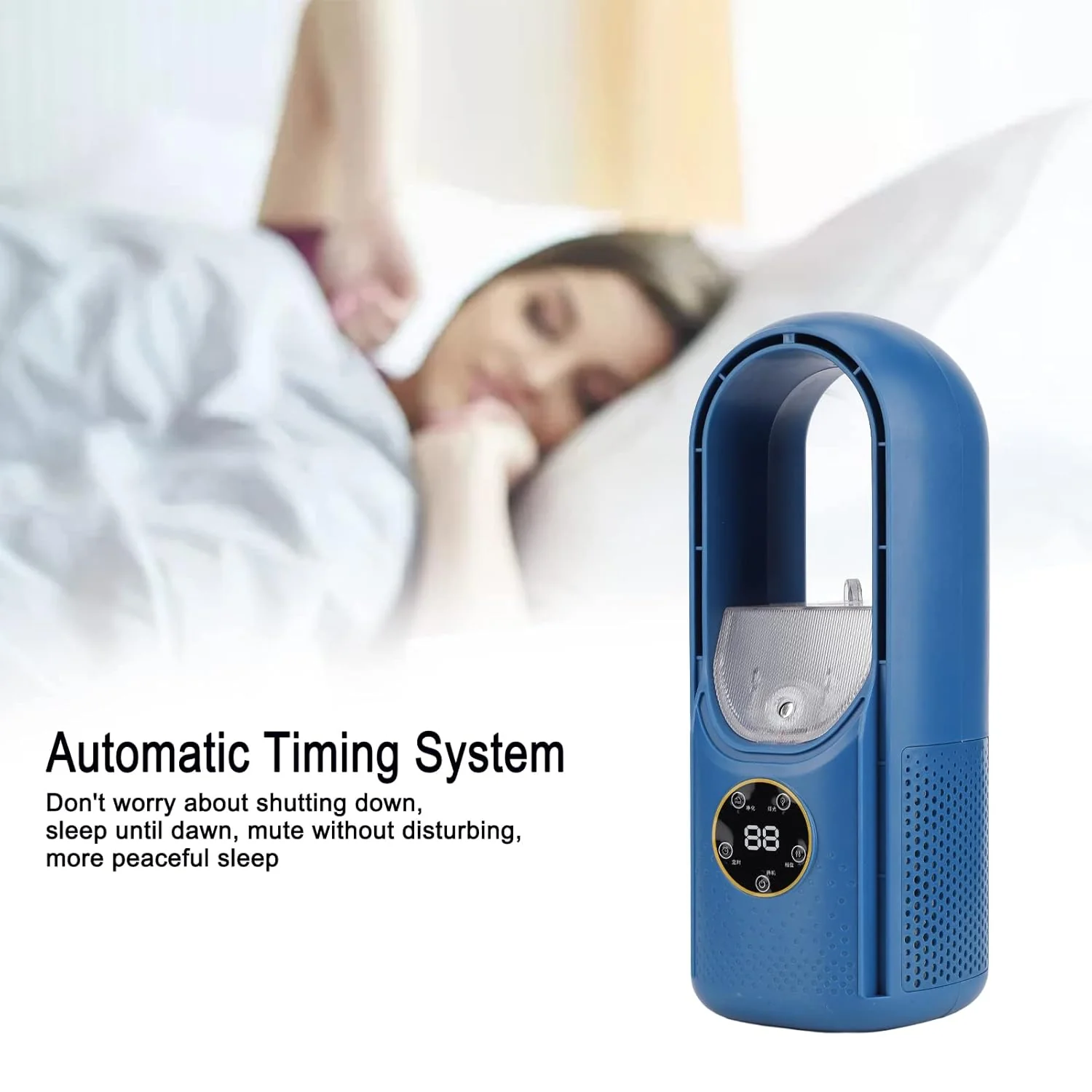 Features a brushless motor for whisper‑quiet operation—great for sleep, work, and study. The soft ambient LED adds a cozy nighttime glow. -